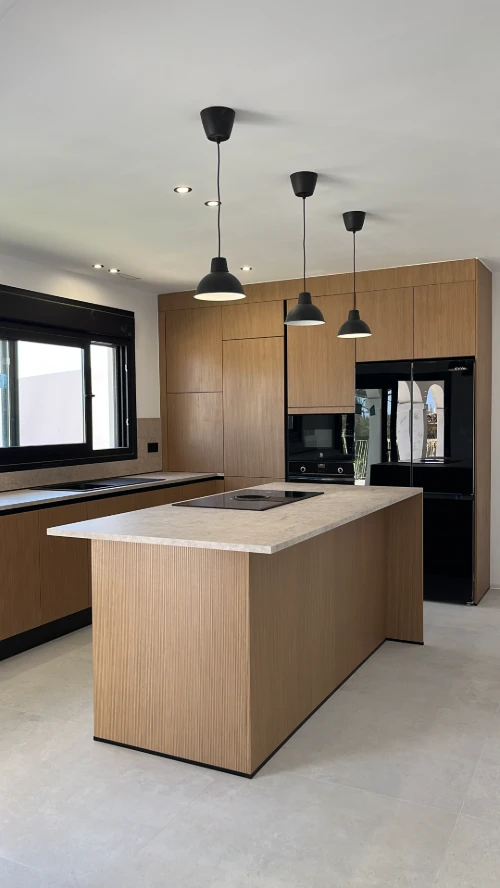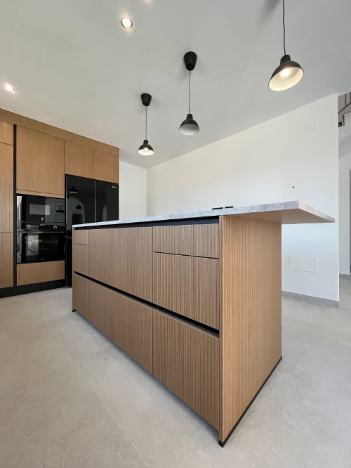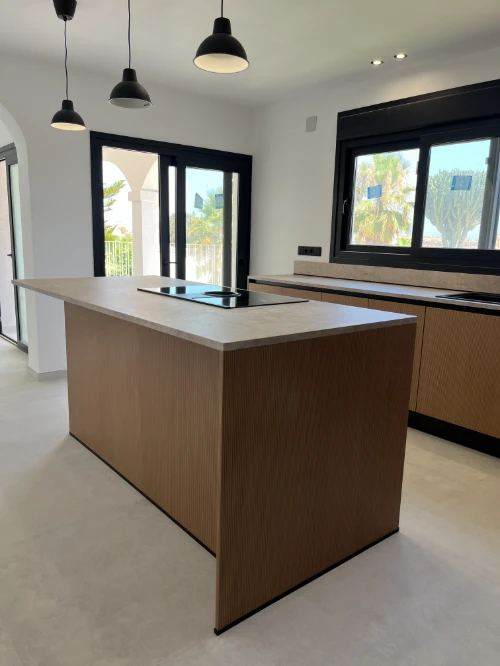 Os presentamos esta cocina con esencia mediterránea, el mobiliario se distribuye en forma de L, buscando que la zona de lavado y preparación quedara enfrente de la zona de cocción ubicada en la isla, facilitando la interacción con familiares y amigos a la hora de cocinar.