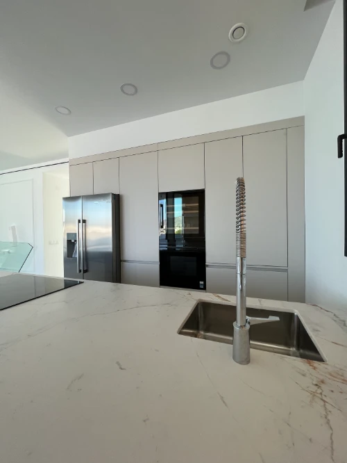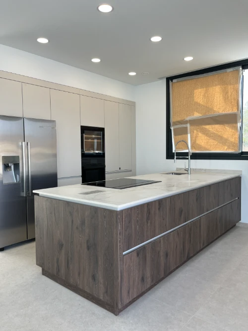 Combinación versátil y atemporal, os presentamos un proyecto de cocina y lavadero, donde hemos conseguido una estancia confortable, funcional y acogedora. Tenemos una composición de armarios columnas que integra electrodomésticos y proporciona amplia capacidad de almacenaje sin olvidar su península que reúne las zonas de preparación, lavado y cocción.